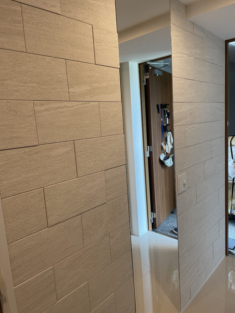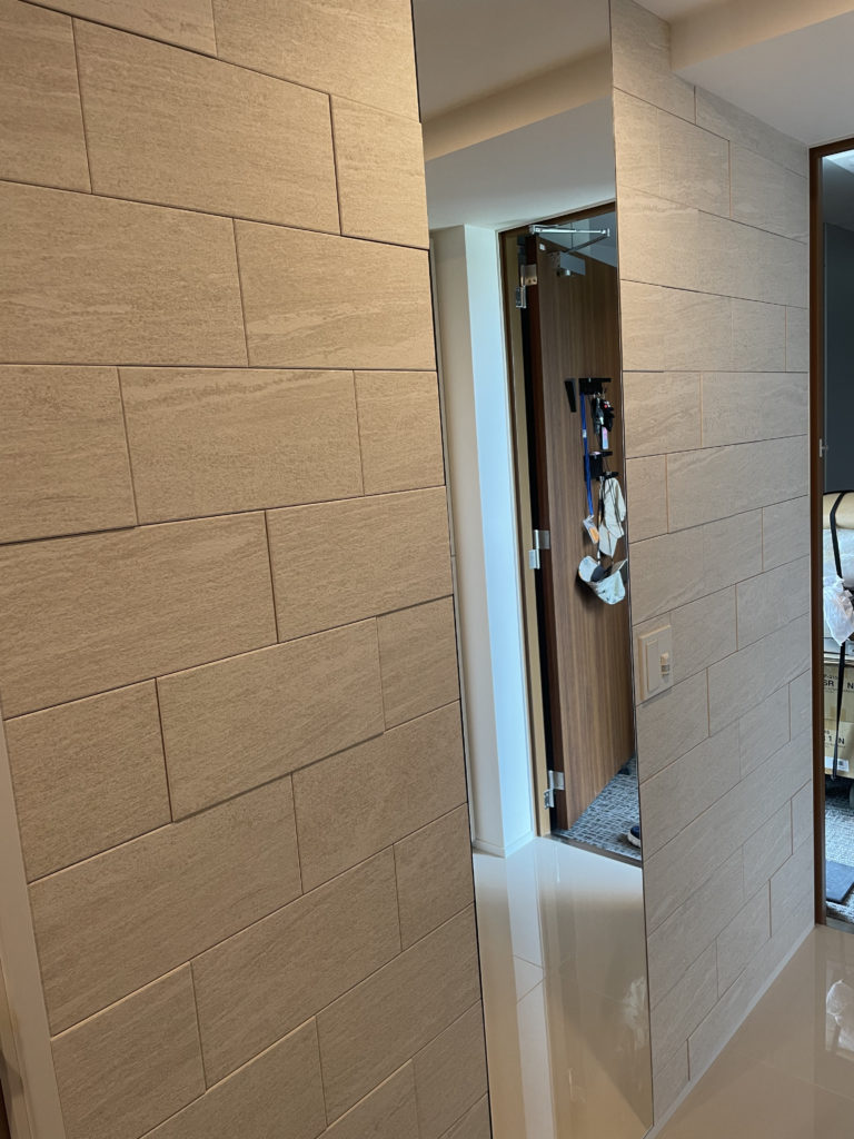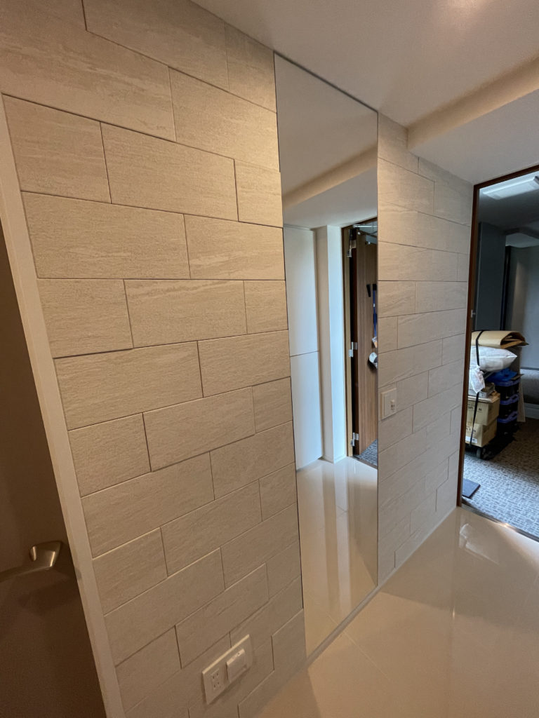 玄関へのエコカラット施工、こちらはオーダーミラーと組み合わせ施工となり玄関ライト位置とミラーのバランス、エコカラットの寸法に合わせて微調整を行い貼り付けいたしました。