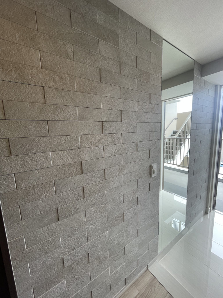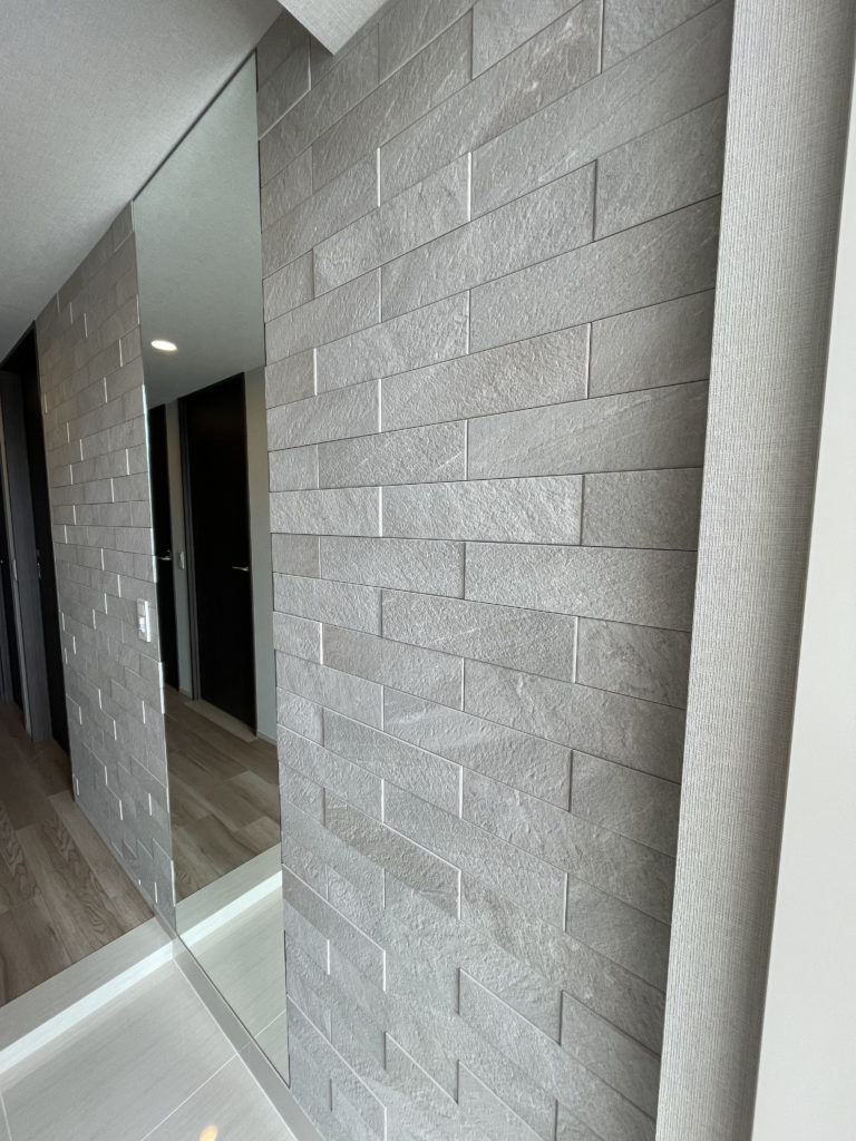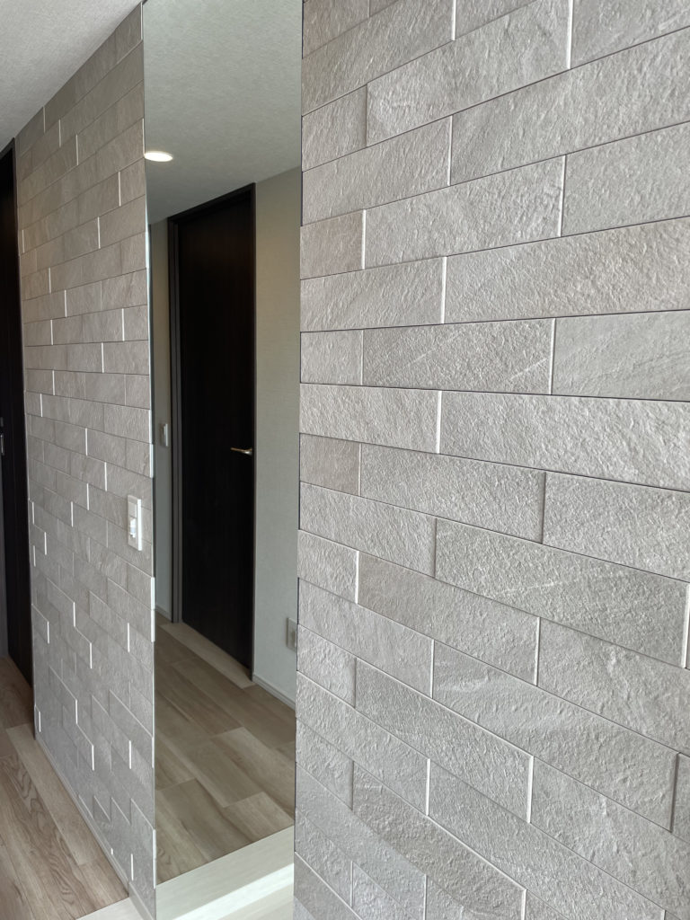 今回は玄関へ「ラフクォーツ ライトグレー」&オーダーミラーを施工しております。
