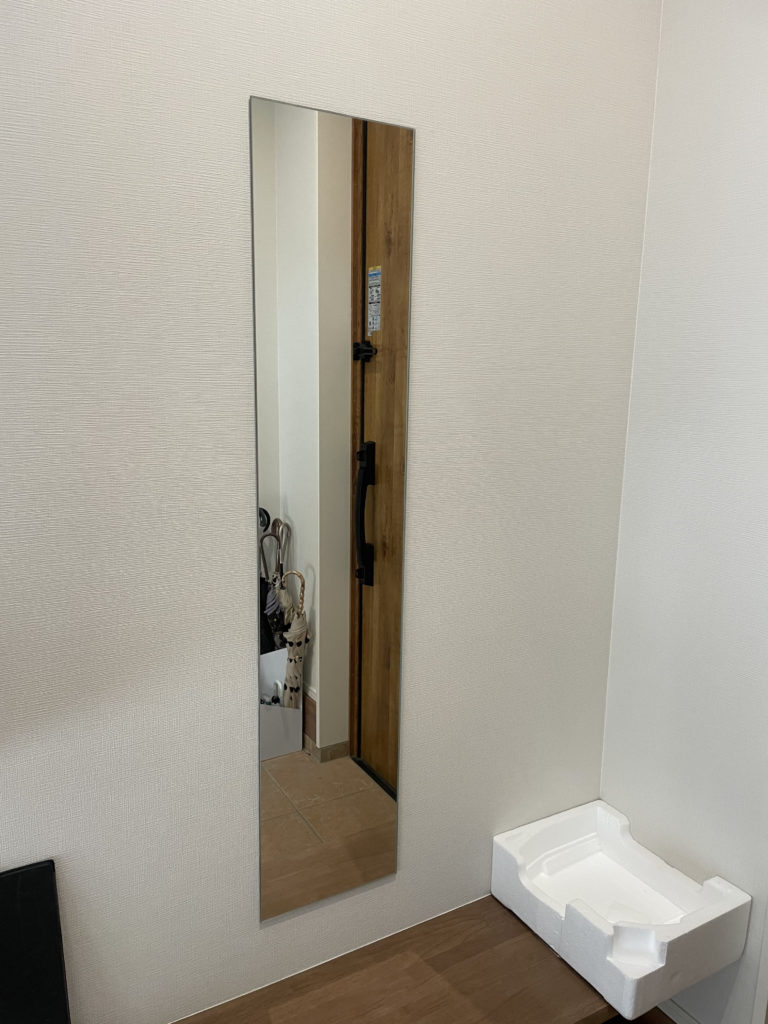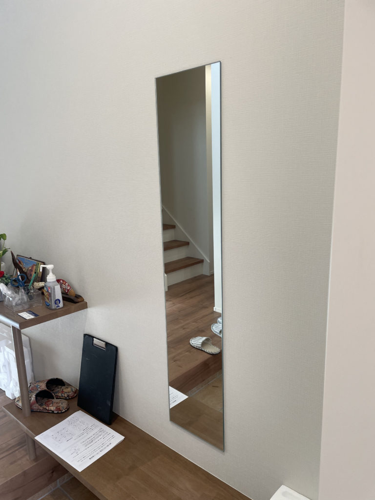 2か所目、玄関のオーダーミラーは飛散防止となり、こちらも位置はお客様のご指定の位置へ貼り付けをいたしました。