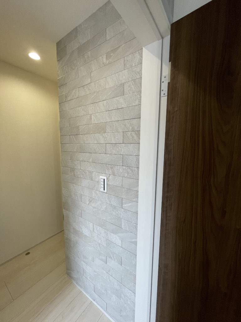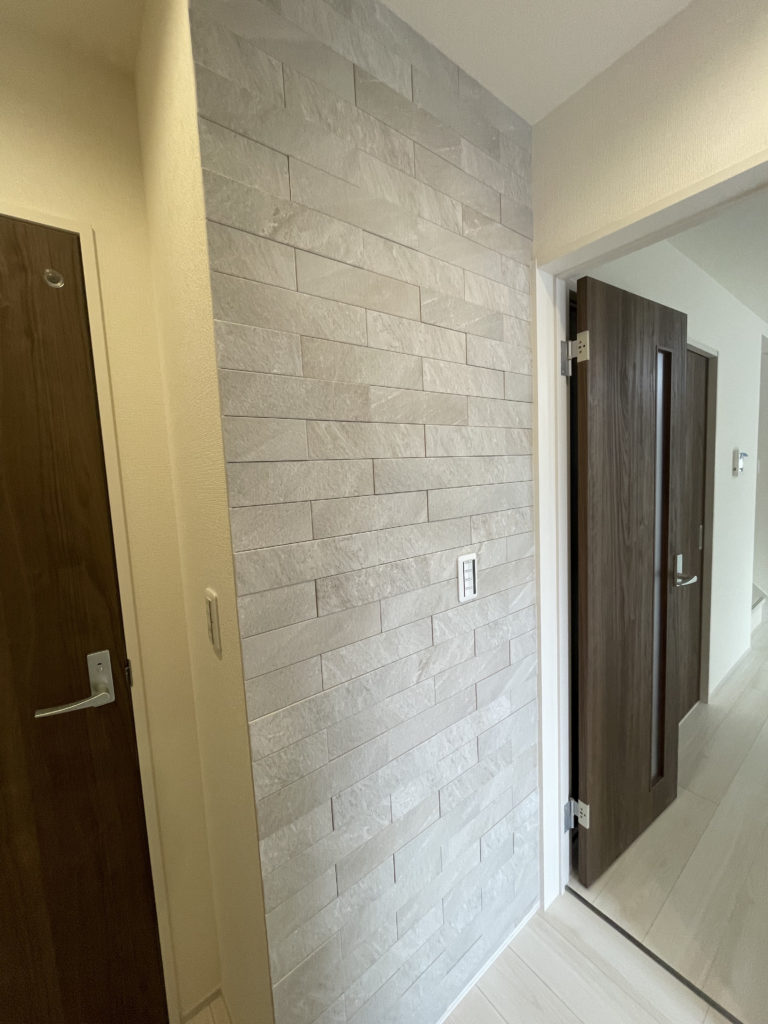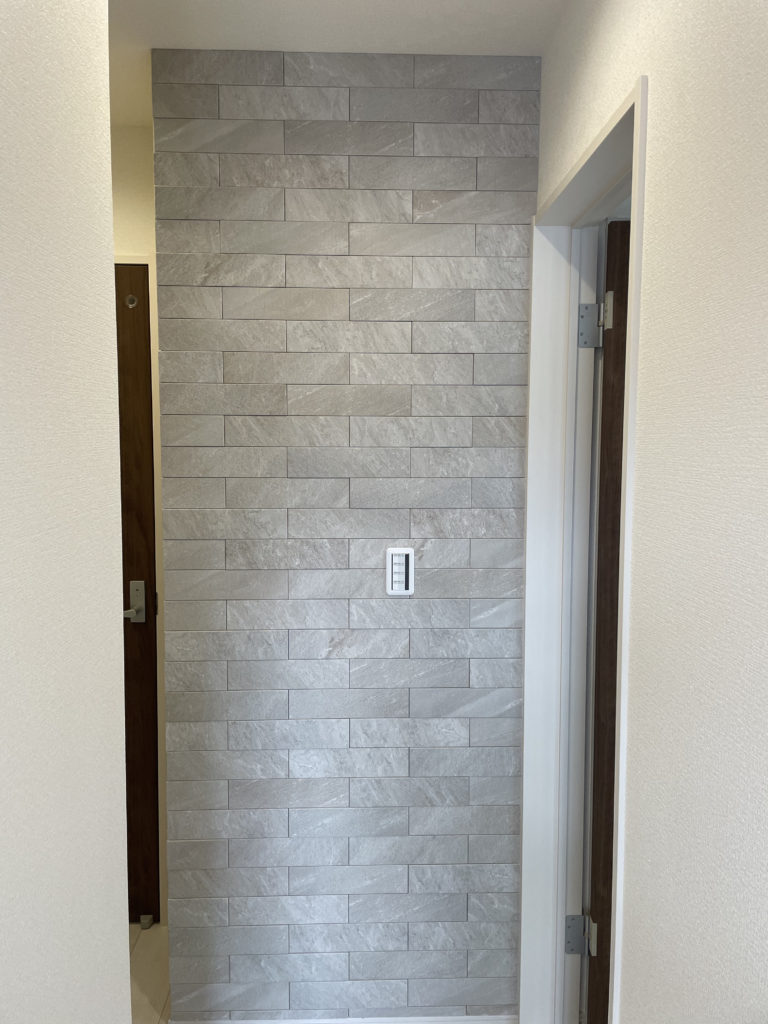 玄関へエコカラットプラス ラフクォーツ(ライトグレー)、出隅部分は見切り材を使用せずにコーキング仕上げにて施工いたしました。