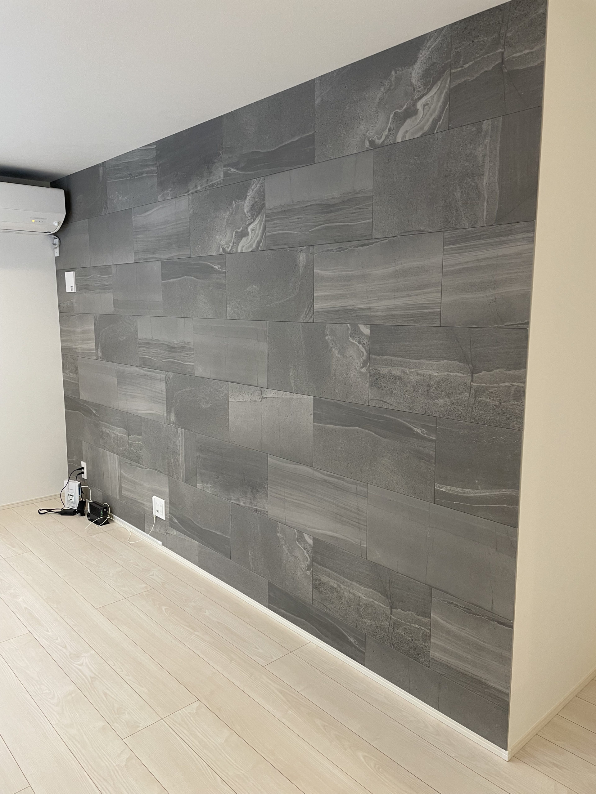 1か所目はリビング エコカラットのストーングレース(ダークグレー)を馬貼りにて施工いたしました、ストーングレースはモジュール設計された商品となりますので上下左右へ1mmのクリアランスをとり施工しております。