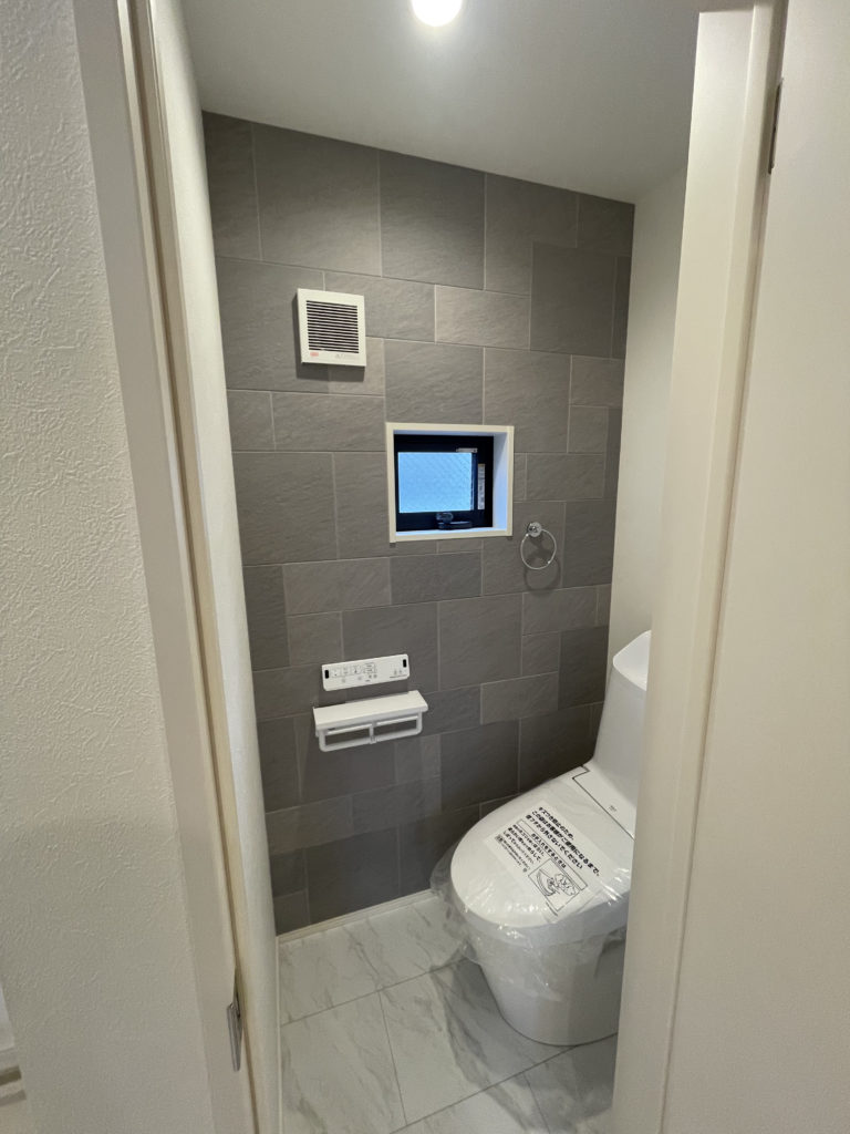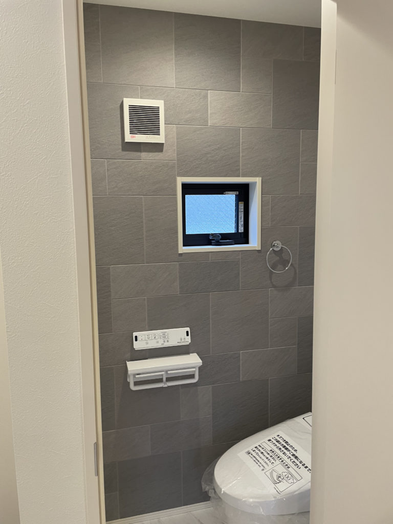 2か所目は2Fトイレ エコカラットのストーンⅡ(グレー)を施工いたしました、割付に多少時間がかかり、コンセントが見えずらく時間がかかってしまいました。