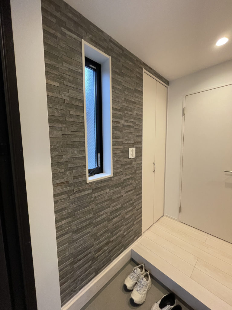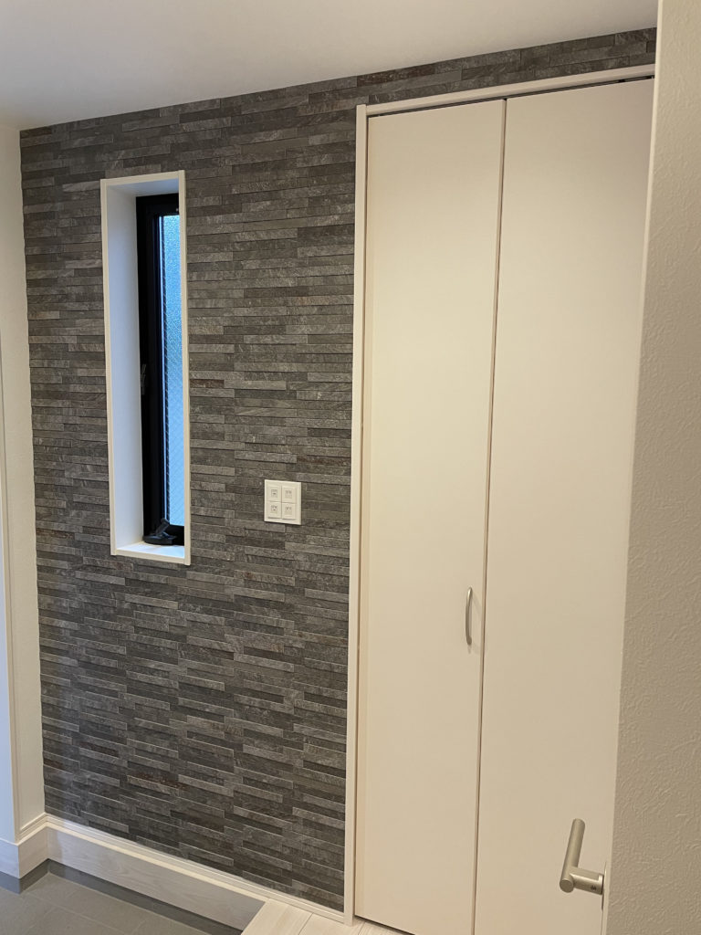 4か所目は玄関 エコカラットのディニタ(ダークグレー)を施工いたしました、壁の不陸に多少手惑いましたがほぼ順調に施工できたと考えます。