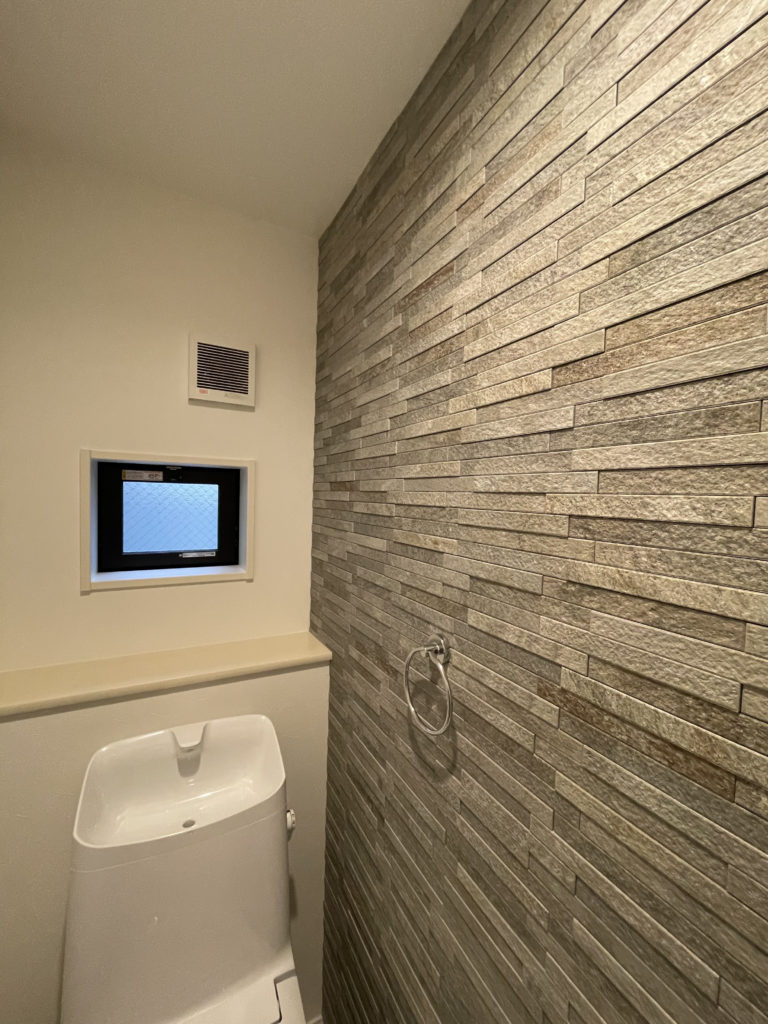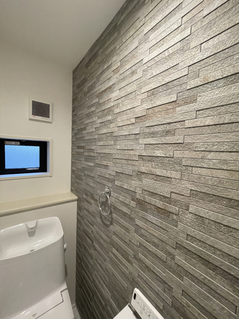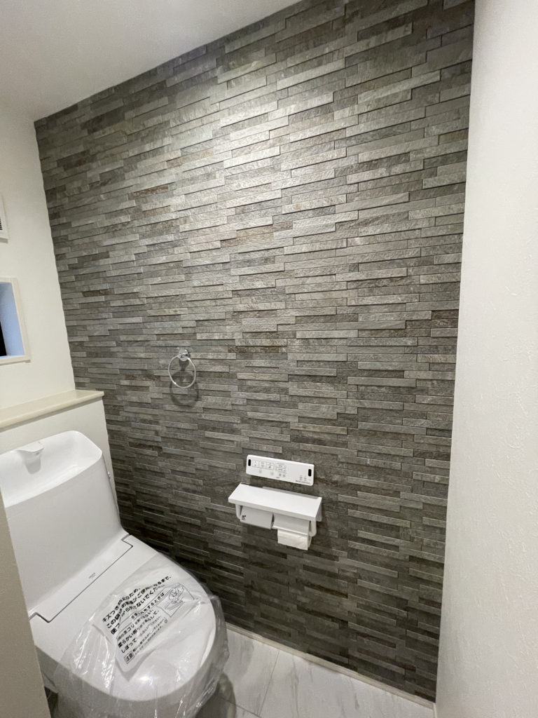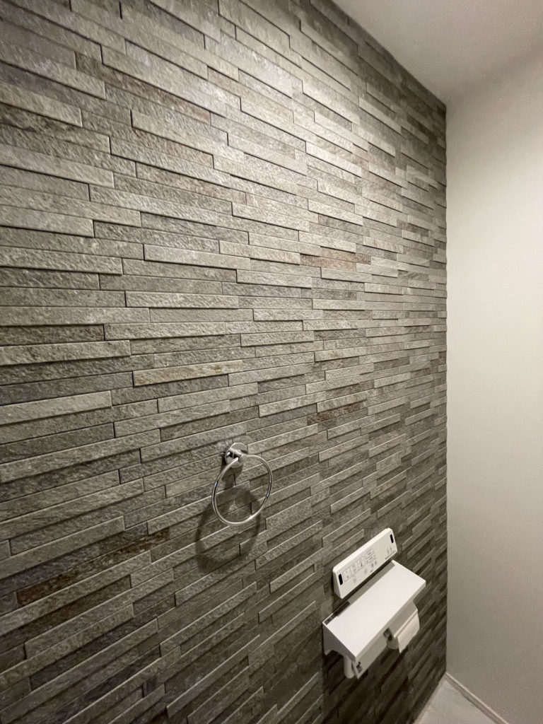 今回はリビング「ストーングレース ダークグレー 馬貼り」・2Fトイレ「ストーンⅡ グレー」・1Fトイレ「ディニタ グリーン」・玄関 「ディニタ ダークグレー」を施工いたしました。