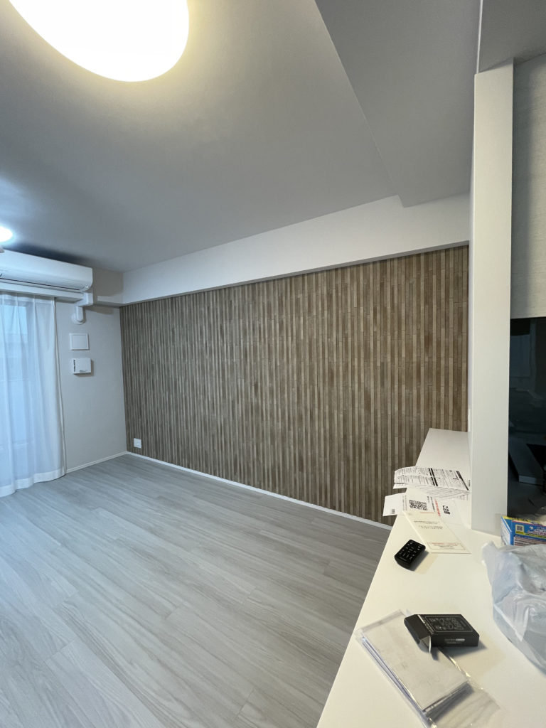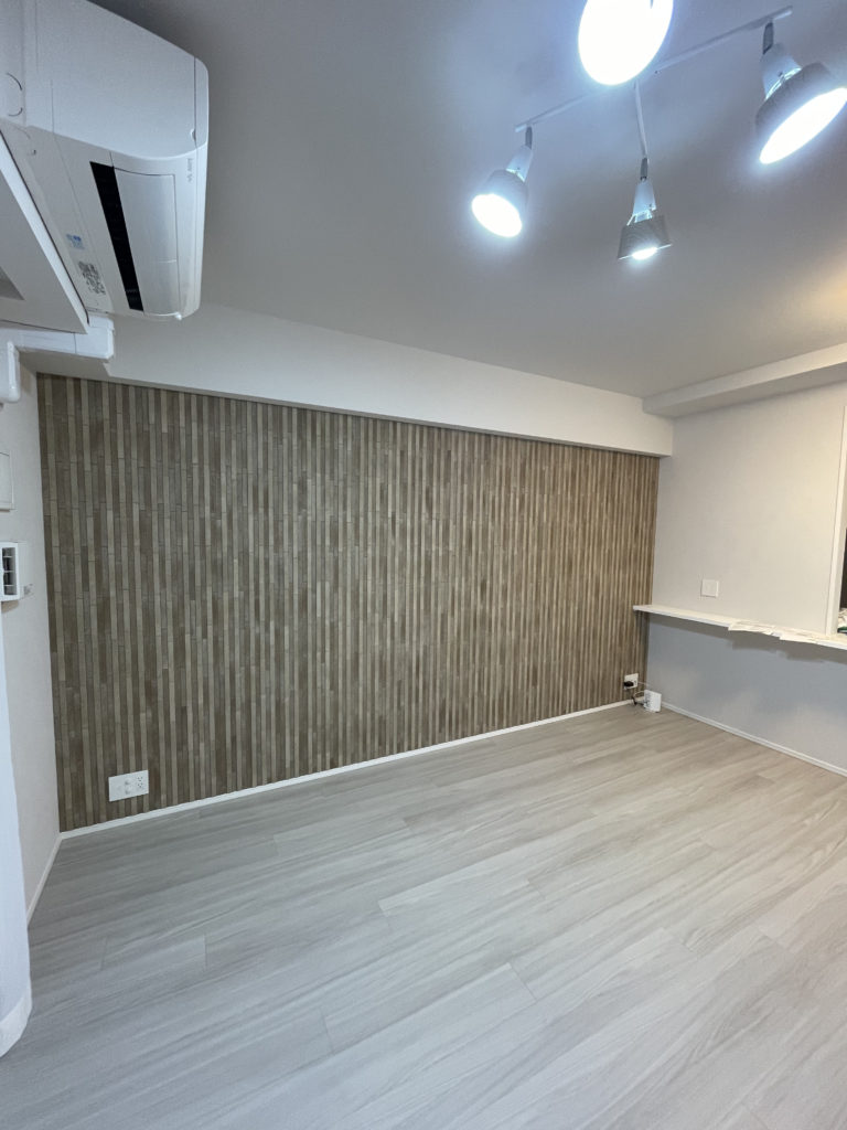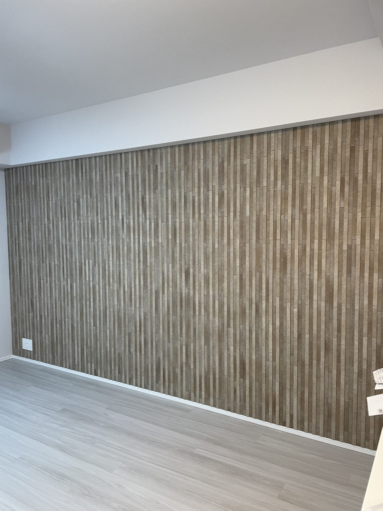 1か所目はリビング エコカラットの陶連子(こういろ)の施工となります左天井より貼り出して右側の入隅にて貼り終いにしております右手カウンターの上下と幅が異なっております。