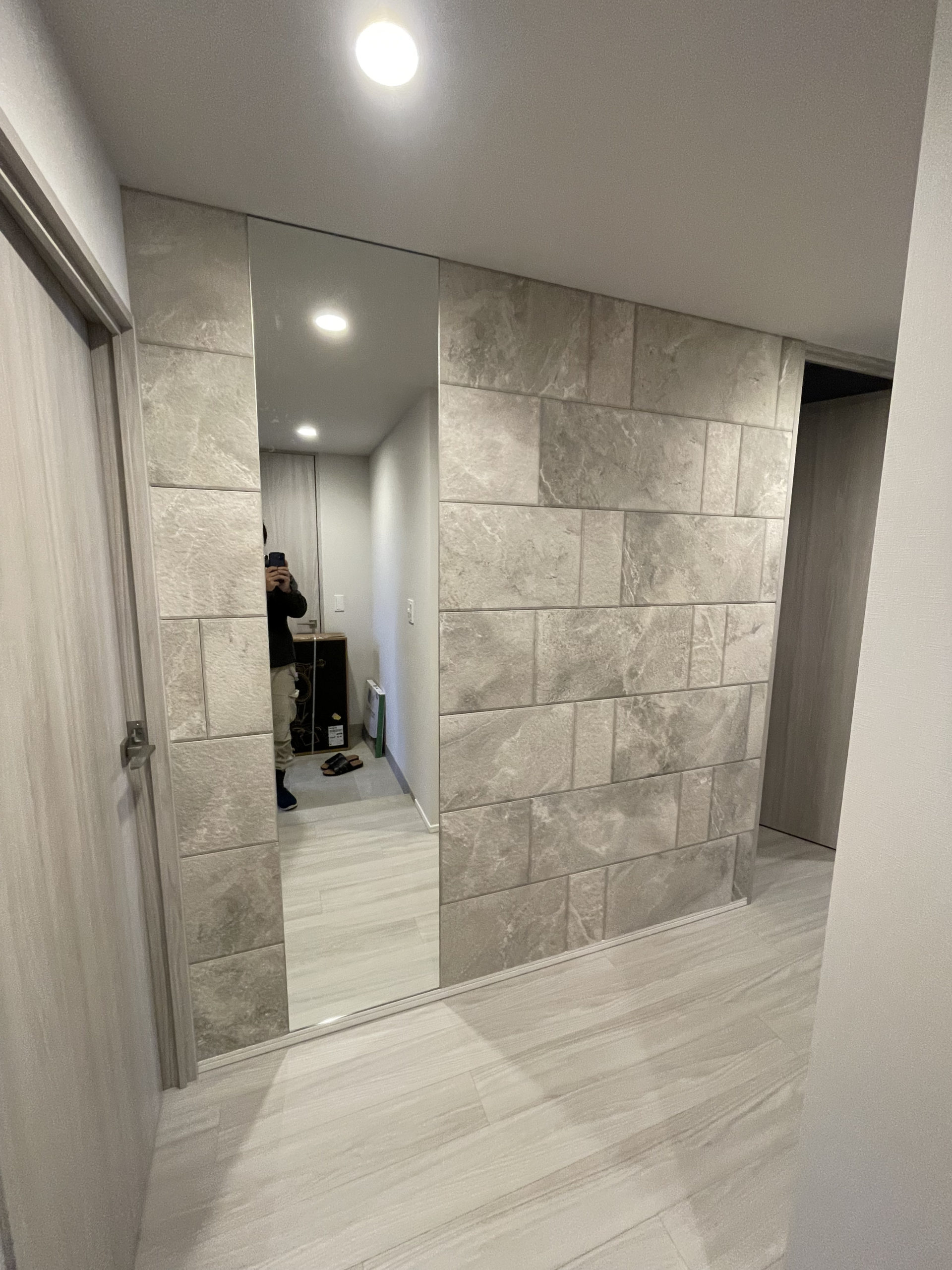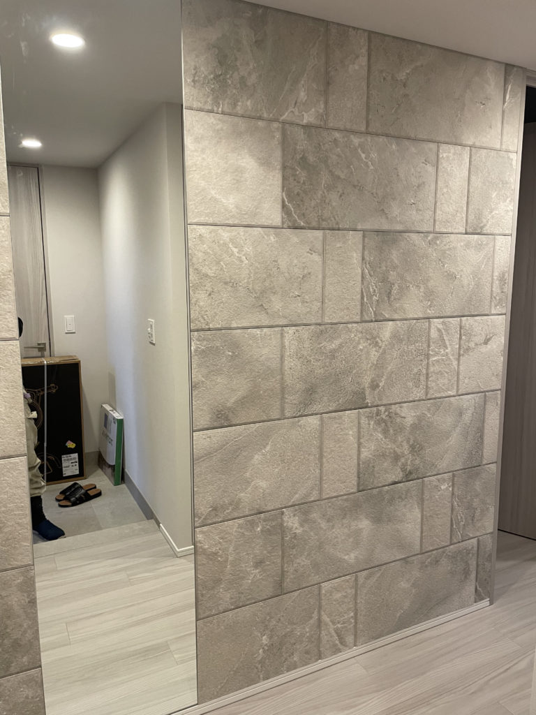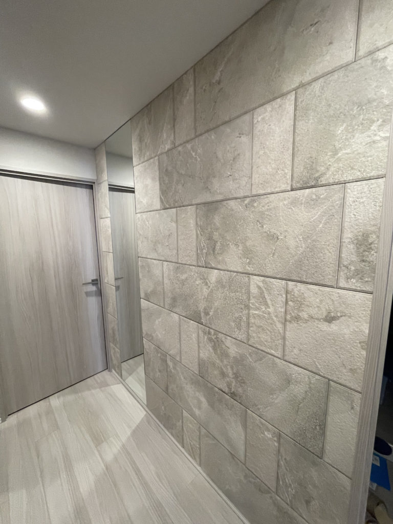 2か所目の玄関エコカラットはサンティエ(アイボリー)&オーダーミラー施工となります。サンティエはパターンが決まっており見栄えの良いパターンで施工できるように調整しております、こちらの商品はモジュール設計されたタイプとなります。