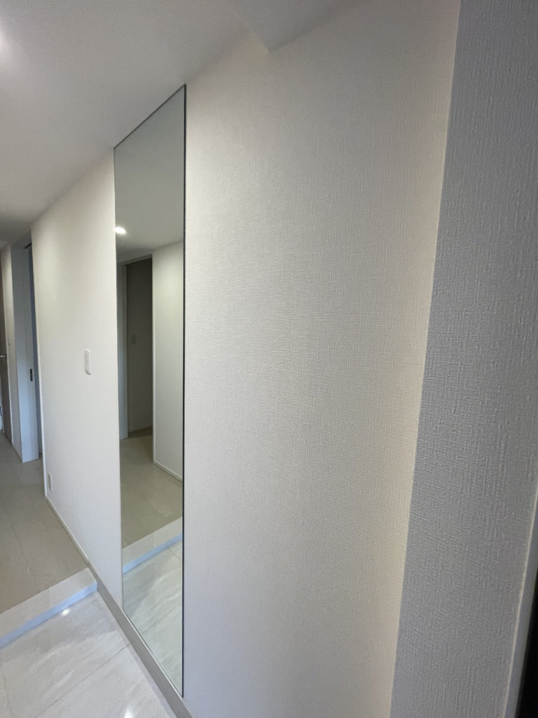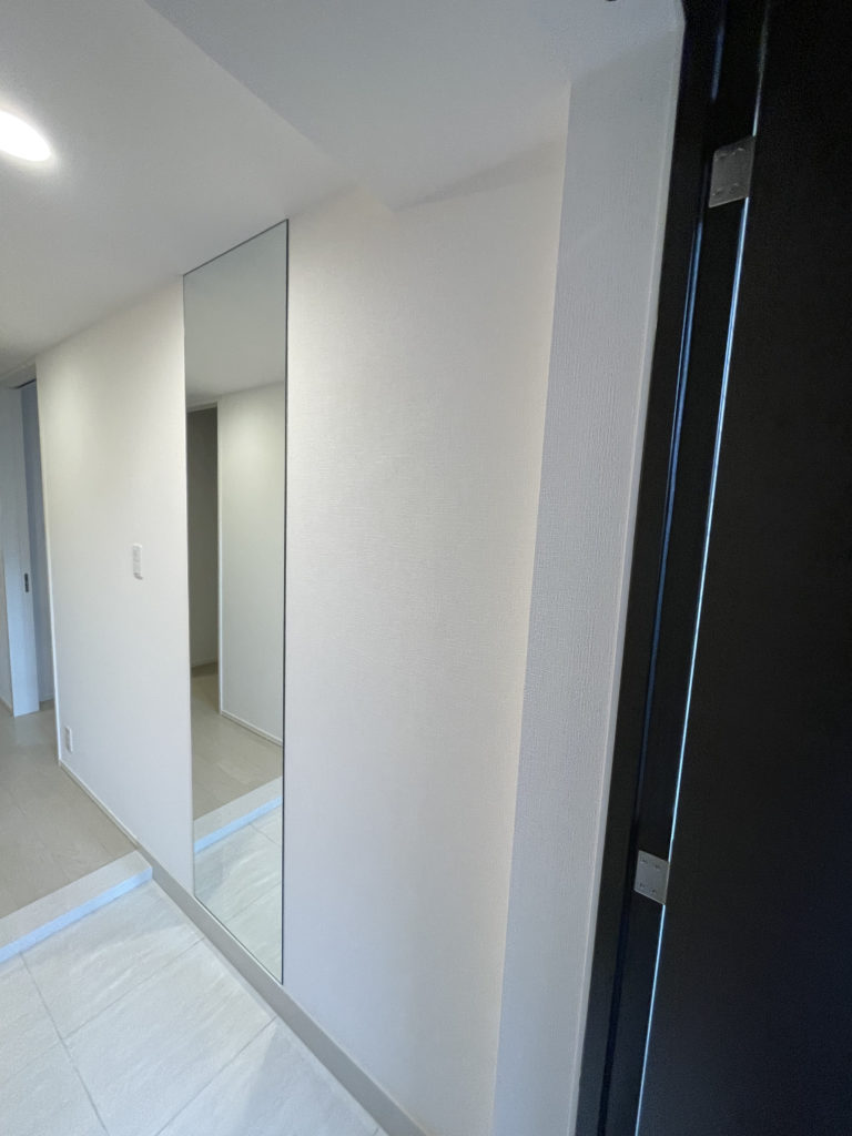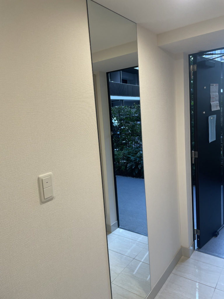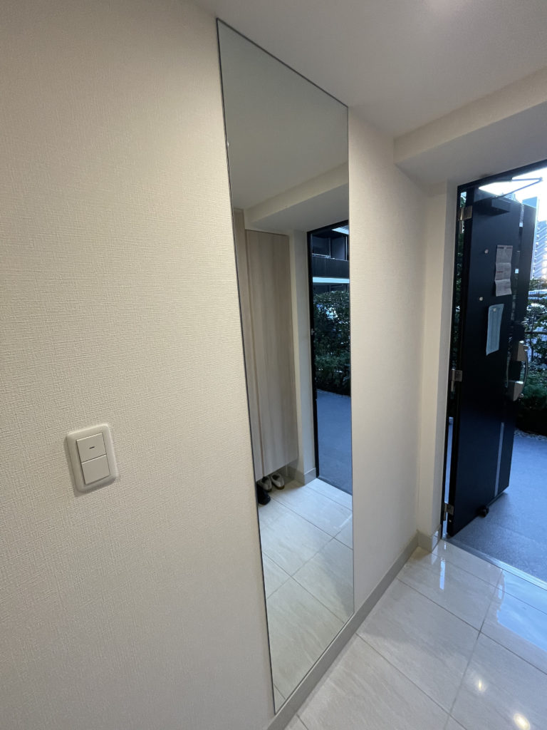 玄関のライト中心へ幅500mmのオーダーミラー施工をいたしました。