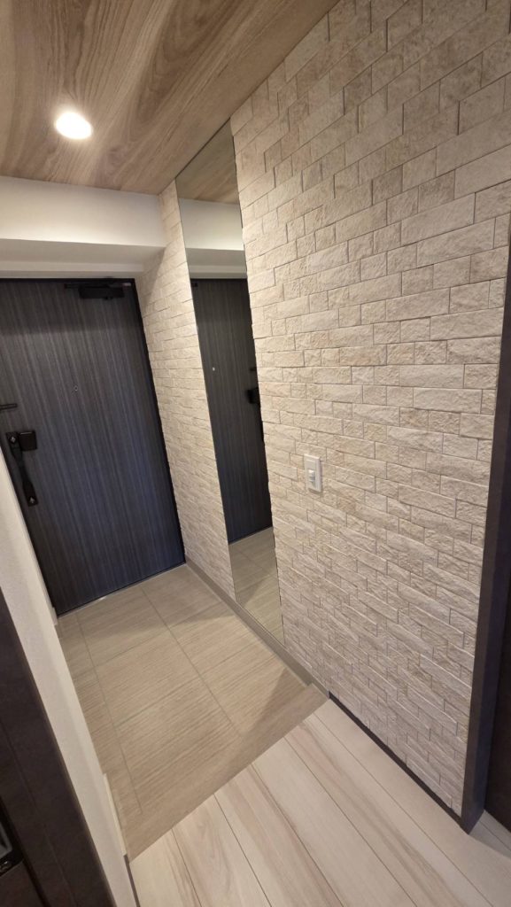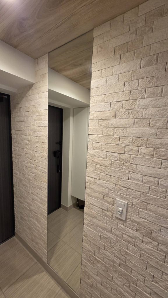玄関のライト中心へ幅450mmのオーダーミラーを貼り付け両サイドへエコカラットプラスのヴィストNX(クリーム)を施工いたしました。