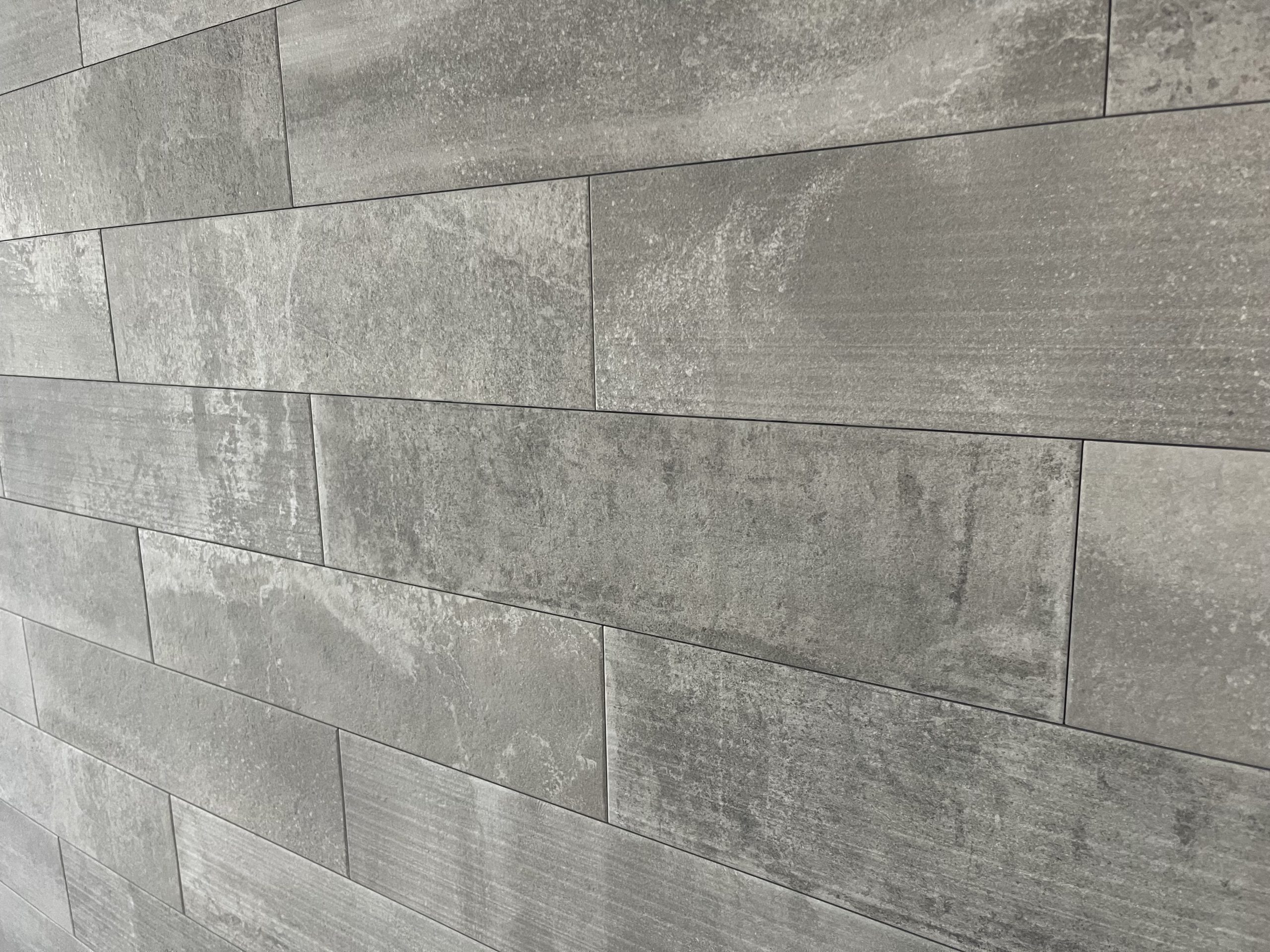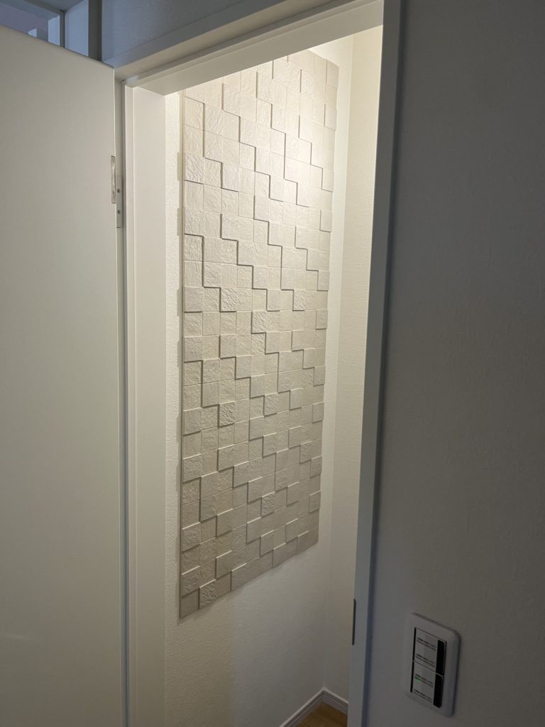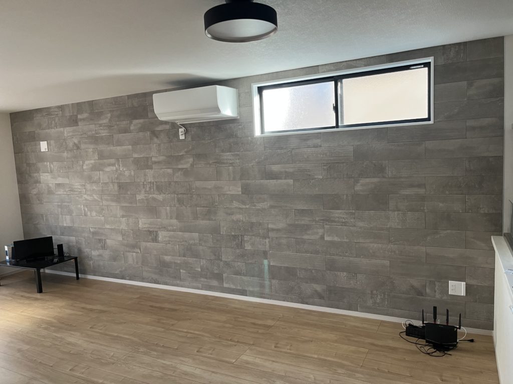 リビングへエコカラットプラスのラフセメント(グレージュ)を施工いたしました。